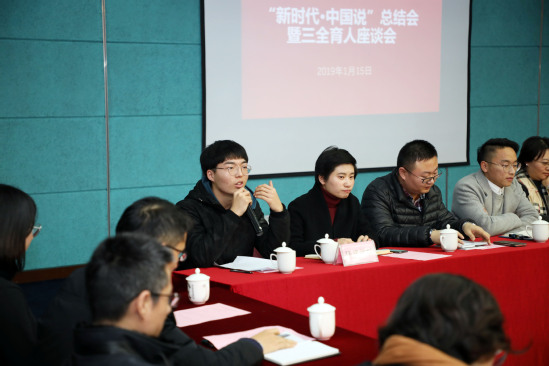 會上,學(xué)生工作部(處)部(處)長牛翔宇圍繞“新時代·中國說”,從立意、設(shè)計、組織、實施以及推廣等方面介紹了本次活動的基本情況,講述了活動背后師生全員參與、通力合作、奮斗拼搏的故事,并就今后大學(xué)生講師團的能量發(fā)揮、學(xué)風(fēng)建設(shè)的深入推進、“三全育人”體系的夯實強化作了進一步思考與匯報。隨后,與會師生代表圍繞活動準備過程中的奮斗與收獲、“三支隊伍”協(xié)同過程中的角色與功能以及“新時代·中國說”的意義與后續(xù)推廣進行踴躍發(fā)言。大家一致認為,“新時代·中國說”既是課程思政改革的一次創(chuàng)新,也是“三全育人”的一次重要嘗試,激發(fā)了蘊藏在學(xué)生中的正能量,提升了教師們的育德意識和育德能力。