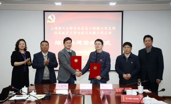 吳松代表學校歡迎郭杰忠一行來訪,并向客人介紹了學?;厩闆r,著重介紹了學校學科建設等高水平大學建設情況。校黨委常委、組織部部長孫紅介紹了學校黨建工作情況,光電學院介紹了學院黨建工作情況。郭杰忠就南昌航空大學的基本情況進行了簡要介紹。雙方圍繞黨建、宣傳、科研等領(lǐng)域合作進行了溝通與交流,就加強高校、學院、支部三級黨建聯(lián)建等達成初步共識。最后,上海理工大學光電信息工程教工黨支部與南昌航空大學電科光電教工黨支部進行結(jié)對共建,并簽署相關(guān)協(xié)議。