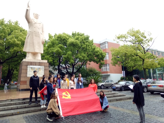 4月29日下午2點(diǎn),細(xì)雨蒙蒙,空氣中彌漫著青春的氣息,正值五四青年節(jié)的到來(lái)之際,外語(yǔ)學(xué)院研究生黨員和積極分子在支部書(shū)記唐瑾老師帶領(lǐng)下,在毛主席像前進(jìn)行莊嚴(yán)的入黨宣誓。同學(xué)們托起鮮紅的黨旗,舉起右手握緊拳頭,莊嚴(yán)地進(jìn)行入黨宣誓?!拔抑驹讣尤胫袊?guó)共產(chǎn)黨,擁護(hù)黨的綱領(lǐng),遵守黨的章程,履行黨員義務(wù),執(zhí)行黨的決定,嚴(yán)守黨的紀(jì)律,保守黨的秘密,對(duì)黨忠誠(chéng),積極工作,為共產(chǎn)主義奮斗終身,隨時(shí)準(zhǔn)備為黨和人民犧牲一切,永不叛黨。”