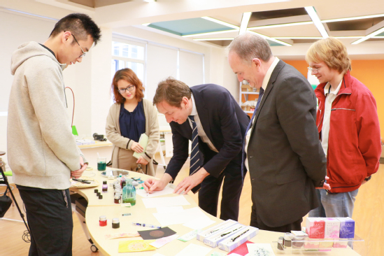隨后,Mark Power先生一行先后參觀了校園建筑、教學(xué)區(qū)域以及教職工辦公區(qū)域等,并與學(xué)生社團(tuán)代表進(jìn)行簡(jiǎn)要交流。