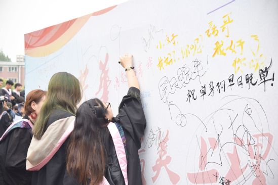 文字,最能表達(dá)內(nèi)心的真摯。“歲月芳華,青春留言”的展板成為了同學(xué)們互訴衷腸的地方。同學(xué)們用筆寫下對昨日的留戀、對今天的感懷、對未來的期許,空白的展板逐步被一字一句填滿。文字背后,纏繞著對大學(xué)時(shí)光的留戀,交織著對校內(nèi)師生的不舍,也鐫刻著面向未來時(shí)的殷切夢想。梳理展板上的內(nèi)容,能發(fā)現(xiàn)學(xué)子對母校、對同窗好友的留戀,對未來、對激蕩人生的暢想。畢業(yè)在即,留言板上的一句句話語充盈在心間,濃濃師生之意、友誼之情和惜別之念滿溢校園。
