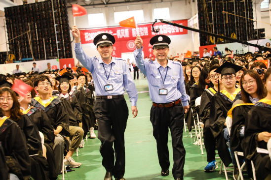 隨著音樂聲起,陪伴學生四年的“上理家長”——畢業(yè)班輔導員、保衛(wèi)處、后勤處的教職員工們在陣陣掌聲中入場,奏響了畢業(yè)典禮的序曲。隨后,“尚理之歌——上海理工大學2019屆學生畢業(yè)留念”專題片如期“上映”,畢業(yè)學子們大學四年的片段快速穿梭,拉開了畢業(yè)典禮的序幕。
