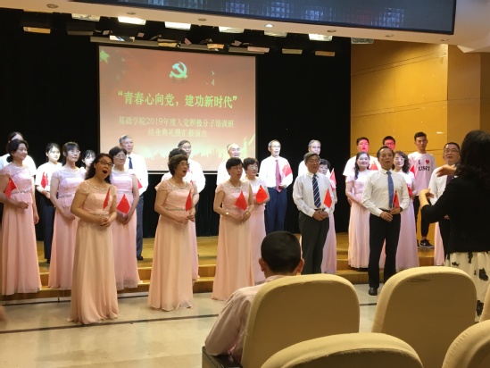 離退休黨委宣講組成員兼特邀黨建組織員張忠賡、邱喜生、蘇金發(fā)等老同志為基礎(chǔ)學(xué)院2019年度入黨積極分子培訓(xùn)班作輔導(dǎo)報(bào)告,圍繞黨的歷史、黨的章程、黨的基本理論知識(shí)、如何做一名合格的入黨積極分子等主題展開,引導(dǎo)學(xué)生堅(jiān)定政治理想、繼承黨的優(yōu)良傳統(tǒng)、牢記黨的初心和使命,以良好的學(xué)風(fēng)做新時(shí)代的建設(shè)者。此外,關(guān)工委老同志于6月10日參加了“青春心向黨,建功新時(shí)代”——基礎(chǔ)學(xué)院2019年度入黨積極分子培訓(xùn)班結(jié)業(yè)典禮暨匯報(bào)演出。老同志參與學(xué)生們的節(jié)目、與學(xué)員們合唱《我和我的祖國(guó)》,展現(xiàn)了紅色精神的傳承與發(fā)揚(yáng),把會(huì)場(chǎng)氣氛推向了高潮。