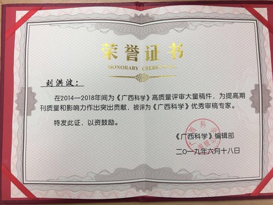 2019年6月18日,《廣西科學(xué)》雜志編輯部為近年來(lái)的優(yōu)秀審稿專家授予榮譽(yù)證書(shū),環(huán)建學(xué)院劉洪波老師被評(píng)為2014-2018年度《廣西科學(xué)》雜志的優(yōu)秀審稿人。