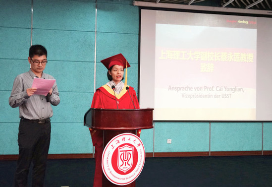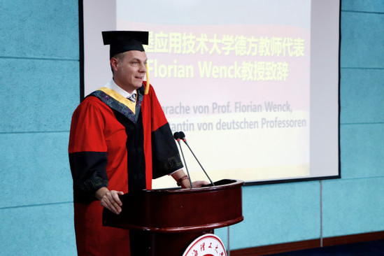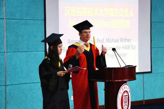 上海理工大學副校長蔡永蓮教授首先代表學校向畢業(yè)生們表示了祝賀,并對他們在畢業(yè)后的工作和學習提出了殷切希望。蔡永蓮強調(diào),機遇不是偶遇,希望同學們在今后的工作和學習中,積極主動,奮力拼搏。祝愿畢業(yè)生們離開校園后依舊能夠勤學不輟,實現(xiàn)理想。 隨后,漢堡應用技術大學項目負責人Michael R?ther教授、中方教師代表沈建強教授和德方教師代表Florian Wenck教授分別致辭,共同祝福同學們一帆風順、前程似錦。