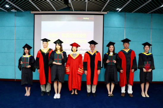 上海理工大學副校長蔡永蓮教授、上海-漢堡國際工程學院常務副院長沈建琪教授、學院書記楊承三教授、漢堡應用技術大學德方負責人R?ther教授,為畢業(yè)生頒發(fā)畢業(yè)證書、學位證書,并與他們合影留念。楊承三宣讀學校關于表彰市級和校級優(yōu)秀畢業(yè)生的決定,蔡永蓮和楊承三為他們頒獎。沈建琪宣讀獲得首屆“陸科思德”獎學金的名單,并和R?ther教授一起為獲獎同學頒獎。輔導員苗朋朋老師為2019屆校友聯(lián)絡員頒發(fā)聘書,希望他們做好同學們與母校之間的情感紐帶,關注母校的發(fā)展。