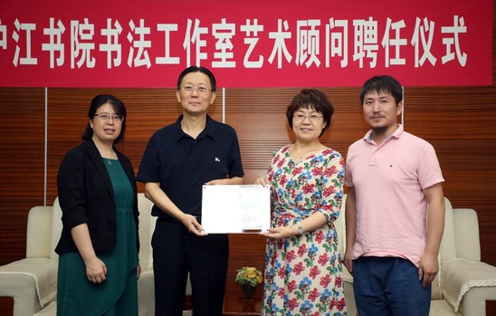 7月4日,上海市書法家協(xié)會副主席、國家一級美術(shù)師宣家鑫受聘擔(dān)任我校滬江書院書法工作室藝術(shù)顧問,聘任儀式在圖文信息中心貴賓接待室舉行,滬江學(xué)院直屬黨支部書記陳紅、黨委宣傳部副部長盧蕭共同為宣家鑫頒發(fā)了聘書。