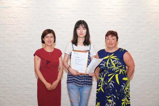 劉芹教授和Andrea Ward女士為陳今亮同學(xué)(中)頒發(fā)獎(jiǎng)學(xué)金證書