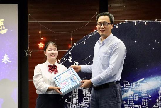 一曲《夜空中最亮的星》響起,院黨委書記程旺在星空板前為新生代表劉霏霏頒發(fā)了新生大禮包。在浩瀚的星空中,274位外語學院新生的名字,凝聚成DREAM——夢想。它寓意著外語學院的每一位學子懷揣著最美好的初心,向夢想進發(fā)。仰望星空、腳踏實地、勇敢追夢,成為那顆最耀眼的星星。