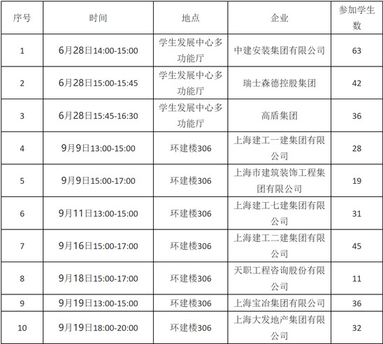 前期,環(huán)境與建筑學(xué)院與上海市室內(nèi)凈化協(xié)會(huì)對接,在學(xué)生發(fā)展中心招聘廳舉辦了2020屆就業(yè)實(shí)習(xí)專場招聘會(huì),來自中建安裝集團(tuán)、上海建科工程咨詢有限公司、上海市室內(nèi)凈化行業(yè)協(xié)會(huì)等18家用人單位到場,提供近100個(gè)就業(yè)實(shí)習(xí)崗位,各個(gè)年級(jí)的學(xué)生都踴躍參與。