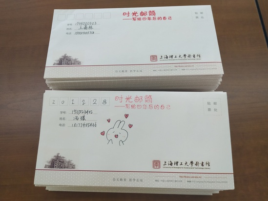 本次活動是圖書館開展的“明志·夢想·初心”2019讀書推薦系列活動之一,以“寫給四年后的自己”為主題,在校本部圖書館一樓大廳和軍工路1100號校區(qū)圖書館2樓設(shè)立郵筒,同時圖書館也為同學(xué)們準(zhǔn)備了專用的信封和信紙,寫完信后同學(xué)們自由投遞到郵筒中,本次活動共收到了一百余封信件。圖書館整理并封箱保存這些寫好的信件,到2023年的畢業(yè)季,根據(jù)姓名、學(xué)號發(fā)放信件。