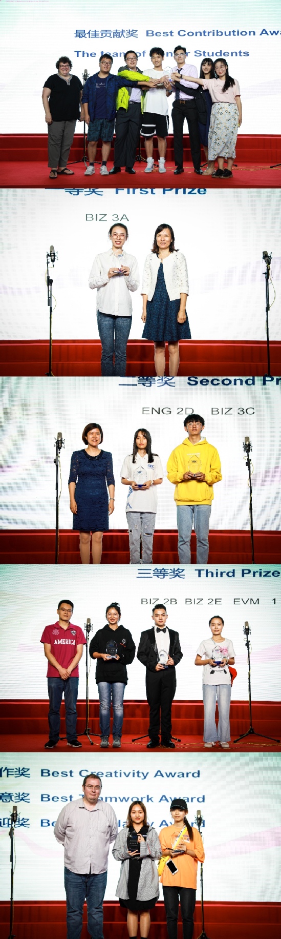 經(jīng)過激烈的角逐,此次合唱比賽最終由Biz3a斬獲一等獎,Eng2d、Biz3c獲得二等獎,Biz2b、Biz2e、Evm1獲得三等獎。此外,Biz1e獲得“最佳臺風獎”,Me1獲得“最佳協(xié)作獎”,Biz1b獲得“最佳創(chuàng)意獎”,Biz1c獲得“最受歡迎獎”。 評委為獲獎班級頒獎。