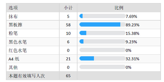 主題調(diào)研階段,老師們提出了很多有利于學(xué)院發(fā)展的好建議,其中關(guān)于課堂的問題比較集中。針對(duì)課堂教學(xué),黑板擦的需求高居榜首,達(dá)到了89.23%,都想有一塊優(yōu)質(zhì)的黑板擦,在征求老師們的建議后,學(xué)院辦公室根據(jù)教學(xué)需要,秉承為教師服務(wù)的原則,即知即改,立即為老師們按需購買黑板擦等教學(xué)用品。