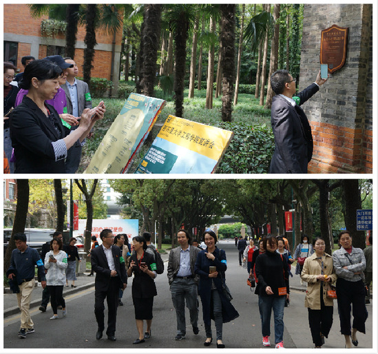 在滬江美術(shù)館出發(fā)前,每位參與教工在掃碼簽到后需要回答11道包含上理工校史知識、新中國成立七十周年和“不忘初心、牢記使命”主題教育相關(guān)知識,還要完成對學(xué)校祝福、對未來的期盼等3道文字填寫題,抒發(fā)愛國榮校的美好愿景;漫步滬江文化園時掃碼銘牌,體驗學(xué)校“建筑可閱讀,文化可觸摸”的滬江優(yōu)秀歷史建筑的人文特色;校史館參觀,讓參與者親歷學(xué)校113周年的發(fā)展脈絡(luò)。本次活動將“愛國榮?!苯逃汀敖〔浇∩怼被顒酉嘟Y(jié)合,得到了熱愛健步走活動教師的歡迎和肯定。參與的教職工也以“健步走”的形式,為上海理工大學(xué)113周年校慶獻上祝福!