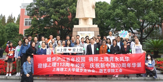 2019年是新中國成立70周年,時值學(xué)校113周年校慶,上理工教工健步走協(xié)會和版藝學(xué)院工會在校工會的指導(dǎo)下,組織了本次活動。版藝學(xué)院黨委書記、校工會健步走協(xié)會會長吳建安作為本次活動的組織者表示,本次活動經(jīng)過精心策劃,以“校慶元素”+“愛國榮?!?“健步運動”為主題,讓教工參與健步走活動的同時,增加了愛國榮校教育,加深對校園文化和校史文化的了解,也讓更多的教職工參與到113周年校慶活動中。