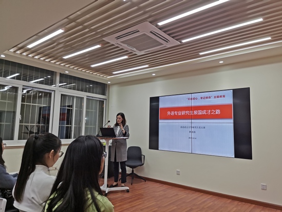 為深入開展“不忘初心、牢記使命”主題教育,2019年11月6日晚,外語學(xué)院英語語言文學(xué)研究生黨支部在學(xué)院112黨建服務(wù)站開展專題黨課學(xué)習(xí),黨課主題為“外語專業(yè)大學(xué)生的成才之路”,本次黨課由外語學(xué)院黨委書記程旺、黨支部書記瞿莉莉共同主講。