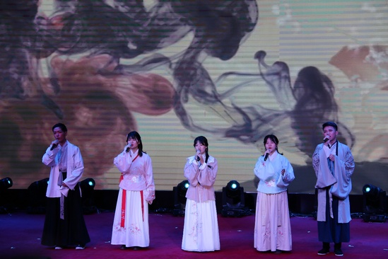晚會分為華風(fēng)雅頌、浩闊幻想、西樂典致、奇思創(chuàng)藝四個板塊。在開場曲《追夢赤子心》的激昂旋律中,同學(xué)們的演唱點(diǎn)燃了現(xiàn)場的氣氛;漢服走秀《葳蕤》、民樂合奏《綻放》、古風(fēng)聯(lián)唱《千秋》展現(xiàn)了中華文化的博大精深,從服飾到樂器,從古韻到詩賦,給觀眾帶來典雅精彩的文化大賞;原創(chuàng)話劇《你想當(dāng)魯迅?》是上海市第四屆“匯創(chuàng)青春”的獲獎作品,劇目圍繞“轉(zhuǎn)專業(yè)”問題,展現(xiàn)了五四一百年來青年人的精神共性——在各個時代,青年人的理想和職業(yè)選擇都自覺與國家、人民和時代的需要緊密結(jié)合;國標(biāo)舞《I See Fire》、創(chuàng)意舞蹈《boiling》展示了上理學(xué)子的傲人風(fēng)采;魔術(shù)《奇跡之夜》、配音秀《愛情公寓之方言原力》展現(xiàn)了新生代上理學(xué)子的無限創(chuàng)意;中西樂合奏《卡農(nóng)二重奏》弦管樂與民樂交織,優(yōu)雅婉轉(zhuǎn);女聲獨(dú)唱《Paper Heart》贏得了觀眾們的熱烈掌聲。