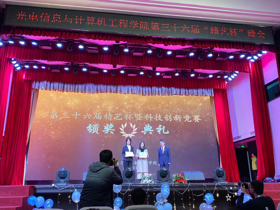 《詠春》以優(yōu)美的古風(fēng)樂曲、華美的畫面和輕柔的舞步拉開了晚會的帷幕。隨后陳海瑾為晚會致辭,她講述了在光電學(xué)院發(fā)展中的親身感受,總結(jié)了這一年來光電學(xué)院的豐碩成就,并為全體光電學(xué)子送上了衷心祝愿。在播放了光電學(xué)子在各類科技競賽中的照片集錦后,隨即進行光電新能力杯、明佳昕仁杯及光電學(xué)院第一屆“院長獎”的頒獎典禮,嘉賓們?yōu)樵诟鱾€賽場上斬獲頗豐的獲獎?wù)哳C發(fā)了獲獎證書,并鼓勵同學(xué)們能夠更加重視對科創(chuàng)能力的培養(yǎng)。