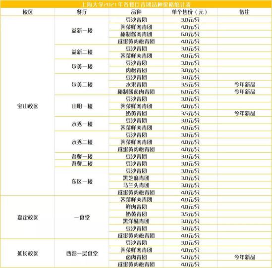 今年,上海理工大學(xué)在早餐和午餐時(shí)間段進(jìn)行青團(tuán)供應(yīng),除傳統(tǒng)紅豆細(xì)沙青團(tuán)、馬蘭頭香干青團(tuán)、咸蛋黃肉松青團(tuán)等口味,還創(chuàng)新推出蘿卜絲肉青團(tuán)、牛肉青團(tuán)、鮮奶青團(tuán)供廣大學(xué)子選擇購買,青團(tuán)單價(jià)根據(jù)口味不同為3元/個(gè)—5元/個(gè)。
