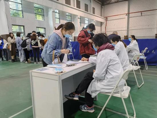 從早上8點(diǎn)開(kāi)始,師生們按照學(xué)院,分時(shí)段、分批次來(lái)到接種點(diǎn),排隊(duì)掃碼登記進(jìn)場(chǎng)。隨后在工作人員的指導(dǎo)下,大家嚴(yán)格按照流程完成疫苗接種。記者注意到,在預(yù)檢區(qū),醫(yī)務(wù)人員會(huì)仔細(xì)詢問(wèn)師生身體狀況,如“你最近有什么不舒服嗎?有吃過(guò)藥嗎?今天有喝過(guò)酒嗎?有對(duì)什么過(guò)敏嗎?”等等,來(lái)判斷其是否符合接種條件。