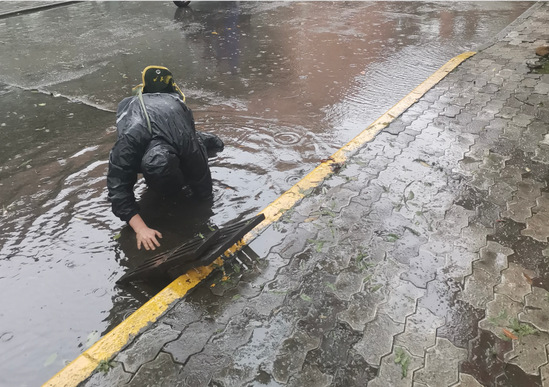 上海財經(jīng)大學(xué)后勤保障人員沖在第一線,應(yīng)急搶險隊伍時刻待命,臺風(fēng)中,不畏風(fēng)雨,堅守崗位,清掃校園,疏通管道,及時處理、及時上報,維護(hù)健康平安校園,保障師生安全度汛。