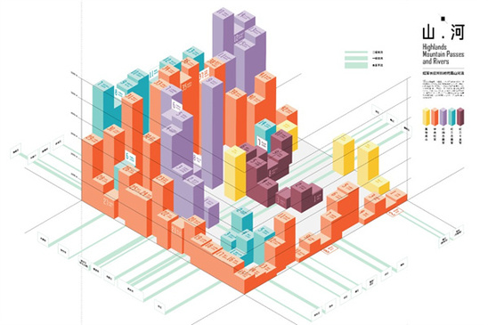 作品《紅軍長征行軍速度圖》和《紅軍長征所歷經的高山河流》就把長征路程上人們難以想象的種種困難,用可視化數據清晰地揭示出來。地圖上,黃色的圓點代表當天行軍到達的地點,并標明停留的日期。圓點上方的每一個粉色小圓點代表10公里的里程,有時候為了強行軍,戰(zhàn)士們要忍受饑寒,在崎嶇的道路上一天一夜行走一百多公里。況且,長征的旅程經過的大部分地區(qū)自然條件都十分艱苦,這些高原、雪山相比于我們熟悉的風景名勝,海拔要遠遠高得多。這些數據的圖形化展現,更容易讓觀眾建立直觀的想象,體會先輩們革命精神的頑強和偉大。