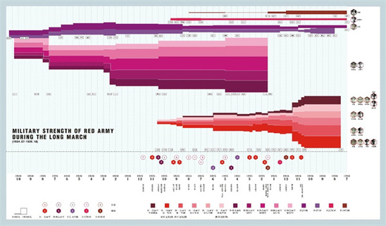 今年正值長征勝利85周年之際,上海理工大學出版印刷與藝術設計學院2020級藝術設計學子通過信息設計與數據可視化的方式,對這一段黨史上波瀾壯闊的重大轉折進行了別開生面的講述。通過調查整理大量歷史文獻資料,將數據和歷史信息進行藝術化處理,設計出一系列兼具信息深度和視覺美感的可視化黨史作品。