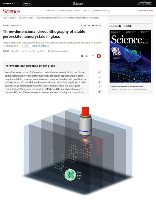 研究成果以《玻璃中穩(wěn)定的鈣鈦礦納米晶體三維直寫》(Three-dimensional direct lithography of stable perovskite nanocrystals in glass)為題發(fā)表在《科學(xué)》正刊,論文共同第一作者為浙大光電學(xué)院博士生孫軻、之江實驗室PI譚德志、上海理工大學(xué)副教授方心遠(yuǎn)。“很多頂尖的科研成果其實都離不開這種跨學(xué)科、跨學(xué)校甚至跨國的合作交流”,顧敏院士介紹,“我們上理工團(tuán)隊深耕全息領(lǐng)域,浙大團(tuán)隊則在光學(xué)材料以及飛秒激光與材料的相互作用方面有深厚的積累,合作成果再次證明了這種科研方式在實現(xiàn)‘0到1’突破中的重要性?!?/span>