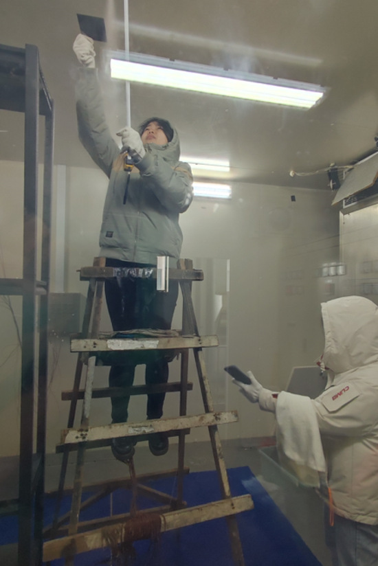“實驗工作量大,環(huán)境惡劣,我們團隊工作很辛苦,特別是六名研究生,他們幾乎每天都會來造雪實驗室做實驗?!壁w巍表示,這些學(xué)生十分刻苦認(rèn)真,為了減少冷風(fēng)對造雪機產(chǎn)生的影響,他們會舉著擋風(fēng)板,“人肉”站在冷風(fēng)機風(fēng)口前,在零下十五度的冷風(fēng)中,經(jīng)常會被吹得瑟瑟發(fā)抖。