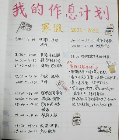 上海對(duì)外經(jīng)貿(mào)大學(xué)會(huì)展與旅游學(xué)院的大一學(xué)生劉芷杉為自己制作了一份詳細(xì)、健康、充實(shí)的寒假作息表:早上8點(diǎn)開(kāi)始新的一天,上午的時(shí)間主要用來(lái)學(xué)習(xí)英語(yǔ)和高數(shù),中午幫助父母做飯,下午將時(shí)間用于體育鍛煉和專(zhuān)業(yè)課的學(xué)習(xí),輔以課外拓展與專(zhuān)項(xiàng)訓(xùn)練,在晚上11點(diǎn)準(zhǔn)時(shí)睡覺(jué)。