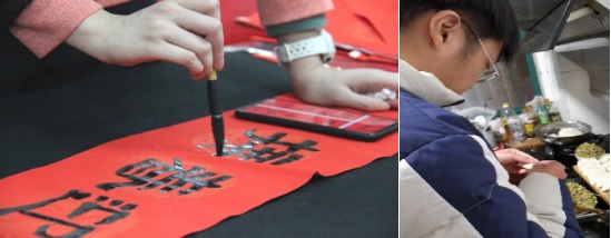 上海對(duì)外經(jīng)貿(mào)工商管理學(xué)院大二學(xué)生盤(pán)孟青為家人精心制作了一道鐵板豆腐,為家里的年夜飯?jiān)O(shè)計(jì)了一份祝福菜單?!岸垢?,寓意著新年幸福,也意味著人們對(duì)美好生活的向往?!保▓D9)上海理工大學(xué)智能化制造36班的易暢同學(xué)說(shuō)道:“春聯(lián)是中國(guó)特有的文化形式,通過(guò)與書(shū)法的近距離接觸,不僅讓空氣中彌漫著濃濃的年味,更能讓我在紅與黑的結(jié)合中感悟藝術(shù)的魅力。”智能化制造9班的江勇敢同學(xué)則打趣道:“餃子形狀像元寶,包餃子意味著包住福運(yùn),今年春節(jié)我體驗(yàn)了包餃子的全過(guò)程,特別有趣?!?/p>