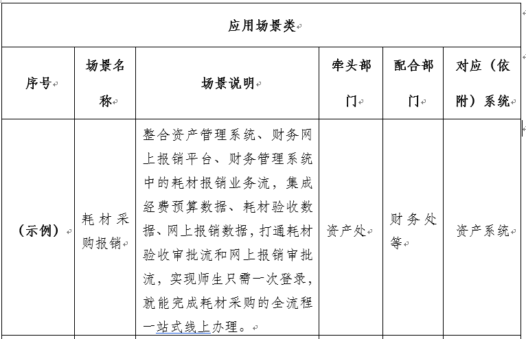 1.應(yīng)用場景建設(shè)類。基于學(xué)?,F(xiàn)有業(yè)務(wù)信息系統(tǒng),聚焦師生迫切需要解決或優(yōu)化的管理與服務(wù)難題,通過流程再造、系統(tǒng)集成、數(shù)據(jù)共享等方式,實(shí)現(xiàn)一口登錄辦理、全流程線上辦完一件事,以提高管理和服務(wù)水平,提升師生服務(wù)體驗(yàn)。場景建設(shè)主要通過升級(jí)改造現(xiàn)有業(yè)務(wù)系統(tǒng)實(shí)現(xiàn),原則上不支持新建系統(tǒng)。申報(bào)格式參考下表,具體見附件一: