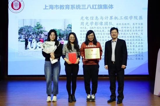 孫躍東為上海市教育系統(tǒng)“三八紅旗集體”光電學(xué)院醫(yī)用光學(xué)影像團(tuán)隊頒獎