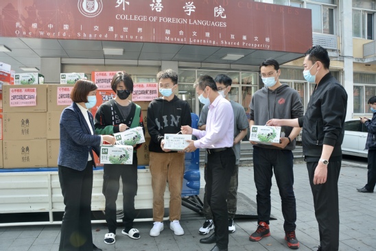 得知這一消息,全國“兩會”閉幕后從北京返滬的全國政協(xié)常委、民建中央副主席、上海市政協(xié)副主席、民建上海市委主委、上海市中華職業(yè)教育社主任、上海公共外交研究院理事會理事長周漢民非常牽掛,在他的親自關(guān)心下,民建市委會員企業(yè)、上海市中華職業(yè)教育社社屬學校群策群力、籌措物資支持我校。3月15日,外語學院院長、上海公共外交研究院常務(wù)副院長劉芹相繼接到上述企業(yè)和學校負責人電話,接洽物資采購或加班制作事宜。校友工作聯(lián)絡(luò)處也主動與后勤管理處和外語學院對接,商議捐贈物資發(fā)放事宜。