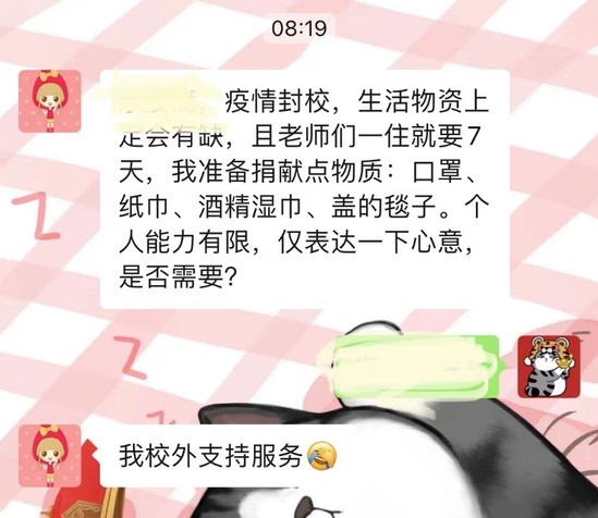 民建市委會員企業(yè)、上海市中華職業(yè)第二進(jìn)修學(xué)院安排專人專車將食品物資運抵軍工路校區(qū)南區(qū)。全國政協(xié)常委、民建中央副主席、上海市政協(xié)副主席、民建上海市委主委、上海市中華職業(yè)教育社主任、上海公共外交研究院理事會理事長周漢民關(guān)心、籌措送達(dá)的食品物資讓南校區(qū)師生暖心。