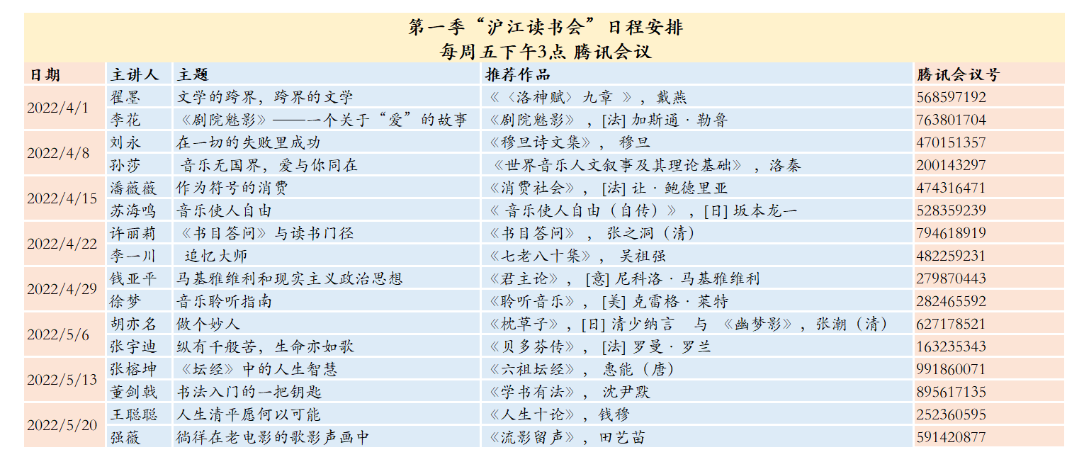 由滬江學(xué)院發(fā)起的“滬江讀書會”第一季將于4月1日正式拉開帷幕,每周五下午3點,在騰訊會議平臺,由2位老師為大家推薦一本好書和音樂,帶領(lǐng)大家一起閱讀欣賞。同時,在留學(xué)生中推出“悅讀中國”系列活動(具體安排見附件)。讓我們的心靈在讀書中獲得自由,期盼疫情早日散去,那時,我們再一起相約,走出校園,看山中的花樹,聽水邊的鳥鳴!