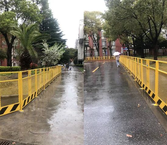 校園內(nèi),在保衛(wèi)處的密切配合下,后勤處經(jīng)過實(shí)地勘察和路線設(shè)計(jì),搭建復(fù)試場(chǎng)地專用通道。因疫情影響,通道所需圍欄無(wú)法租賃及采購(gòu),后勤處緊急與校內(nèi)施工單位地江集團(tuán)協(xié)調(diào)調(diào)撥了400米圍欄,16名工人冒雨施工,趕在考研復(fù)試前將圍欄安裝完畢。同時(shí),保衛(wèi)處也及時(shí)調(diào)整完善安保方案,由2名保衛(wèi)干部及6名安保隊(duì)員對(duì)專用通道進(jìn)行全時(shí)段網(wǎng)格化巡邏,做好對(duì)潮汐通道固定崗和環(huán)建學(xué)院出入通道以及綜合樓周邊等多處點(diǎn)位的人員排布。為了能夠及時(shí)進(jìn)行人員疏導(dǎo)和突發(fā)情況處置,6名安保隊(duì)員從宿舍臨時(shí)搬至綜合樓C區(qū),保衛(wèi)處還協(xié)調(diào)好校園內(nèi)停車問題,做好對(duì)封閉區(qū)域以及周邊環(huán)境全天候的消殺工作。
