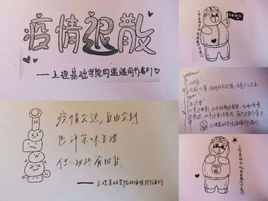 近期,基礎(chǔ)學(xué)院的同學(xué)們還收到了一張?zhí)厥獾淖謼l,上面畫著可愛的“大白”,寫著“疫情退散”“疫情會過,自由會到,也許余味苦澀,但一切終有回甘。”等溫暖的話語,落款人為“上理基礎(chǔ)學(xué)院的溫暖同行者們”。一張張字條承載著黨員教師和志愿者們對同學(xué)們的鼓勵與安慰?!罢娴谋蛔謼l暖到了!”基礎(chǔ)學(xué)院的陳鏐莎說,她也用同樣的方式,畫出了自己心中的“大白”,堅(jiān)定戰(zhàn)疫信心,一同盼春來。