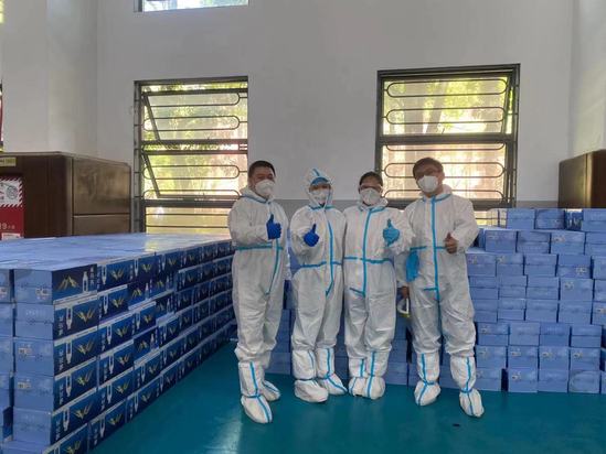 王婷老師和同事一起為同學(xué)送餐、分發(fā)物資