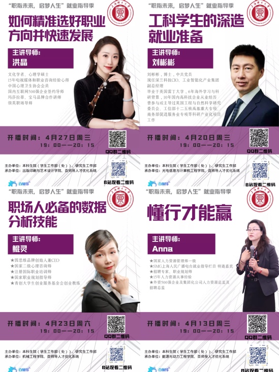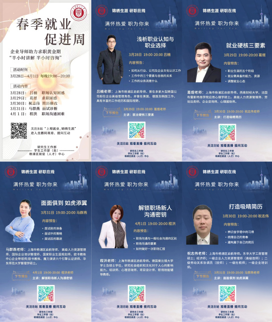 與此同時(shí),學(xué)校黨委研究生工作部、學(xué)生工作部(處)還聯(lián)合楊浦區(qū)就促(人才)中心針對(duì)研究生就業(yè)舉辦“春季就業(yè)促進(jìn)周”,5位經(jīng)驗(yàn)豐富的啟航導(dǎo)師精選職業(yè)認(rèn)知與選擇、就業(yè)必需要素、簡(jiǎn)歷設(shè)計(jì)、面試應(yīng)對(duì)與職場(chǎng)溝通五個(gè)角度,以“半小時(shí)講解,半小時(shí)咨詢”的方式,為200余名研究生進(jìn)行耐心答疑。