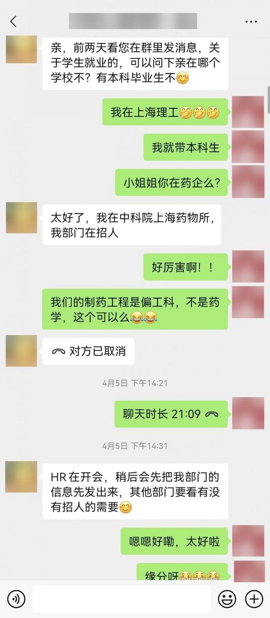 作為拋出“橄欖枝”的鄰居之一,徐白與朱旭平時(shí)只是“點(diǎn)頭之交”,看到群內(nèi)的消息后,就職于中科院上海藥物所藥物安全評價(jià)研究中心的她立即加了朱旭好友,在確認(rèn)了畢業(yè)生的教育背景等基本情況后,反饋給研究中心的人力資源部門,幾天時(shí)間就促成了后續(xù)的線上面試等招聘流程。