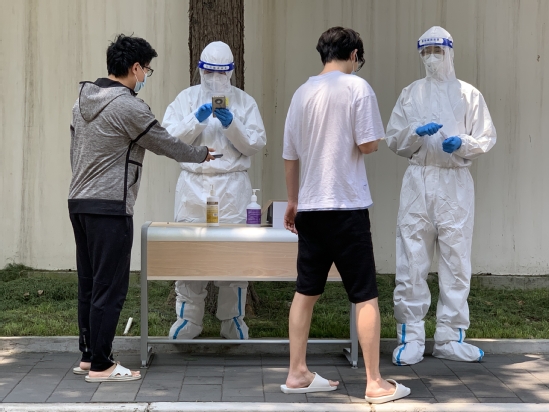 陸詩(shī)雯和“大白”上門(mén)為同學(xué)們進(jìn)行核酸采樣