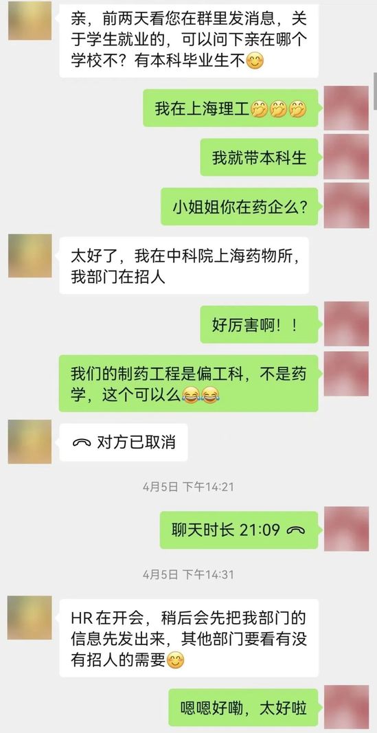 作為拋出“橄欖枝”的鄰居之一,徐白與朱旭平時(shí)只是“點(diǎn)頭之交”,看到群內(nèi)的消息后,就職于中科院上海藥物所藥物安全評(píng)價(jià)研究中心的她立即加了朱旭好友,在確認(rèn)了畢業(yè)生的教育背景等基本情況后,反饋給中心的人力資源,幾天時(shí)間就促成了后續(xù)的線上面試等招聘流程。
