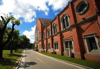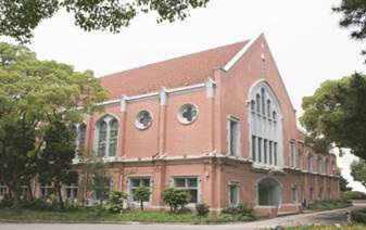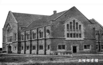 大禮堂與思魏堂為磚混結(jié)構(gòu)建筑,學(xué)院哥特式風(fēng)格。建筑立面上鑲嵌簡(jiǎn)化的哥特式十字花窗和尖券窗,窗洞用細(xì)柱分成豎向長(zhǎng)窗,增強(qiáng)了垂直感和立體感。建筑入口是厚墻線腳和雙聯(lián)扁平拱門(mén)洞。