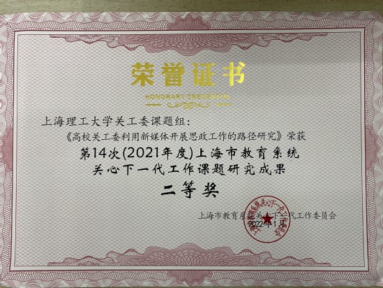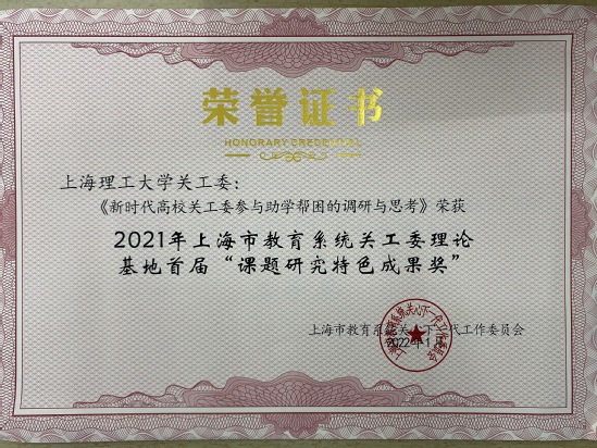 同時,校關(guān)工委注重課題研究,此次受表彰的2021年度課題成果中,我校關(guān)工委課題組《新時代高校關(guān)工委參與助學(xué)幫困的調(diào)研與思考》(課題組組長:田蔚風(fēng))榮獲2021年上海市教育系統(tǒng)關(guān)工委理論基地首屆“課題研究特色成果獎”;《高校關(guān)工委利用新媒體開展思政工作的路徑研究》(課題組組長:蘇金發(fā))、《高校關(guān)工委“五老”參與學(xué)校黨史學(xué)習(xí)教育的實(shí)踐探索與機(jī)制建設(shè)研究》(課題組組長:楊佐平)均獲2021年度上海市教育系統(tǒng)關(guān)心下一代工作課題研究成果二等獎。