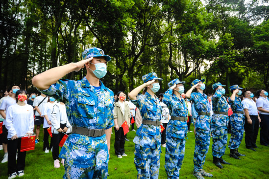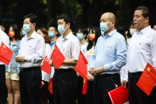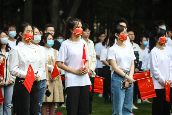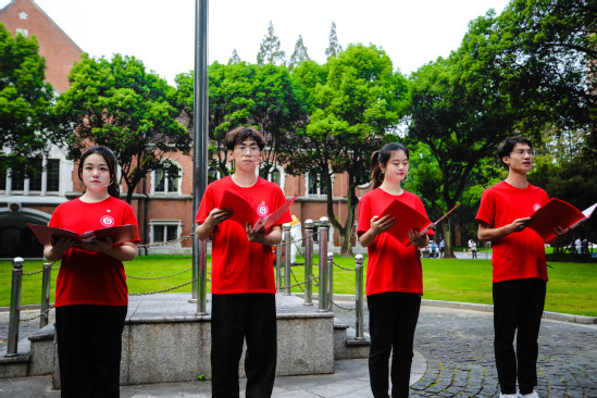 上午7時,國旗班的同學(xué)高擎國旗,邁著整齊的步伐走向升旗臺。在莊嚴的國歌聲中,升旗手將鮮艷的五星紅旗緩緩升起。大學(xué)生藝術(shù)團丁嘉妮、袁瀟語、荊樂銀、唐語凡同學(xué)向祖國獻詞,“青春心向黨,百年再啟航”的深情誓言展現(xiàn)了青年人強國有我、勇?lián)姑膱远ㄐ判摹?/p>