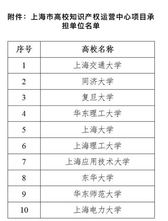 附件:上海市知識產(chǎn)權(quán)局 上海市教育委員會(huì)關(guān)于確定上海市高校知識產(chǎn)權(quán)運(yùn)營中心項(xiàng)目承擔(dān)單位的通知
