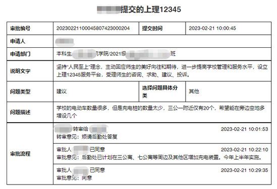 學(xué)生提交的關(guān)于增設(shè)電動(dòng)自行車(chē)充電裝置的建議得到及時(shí)回復(fù)