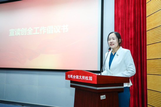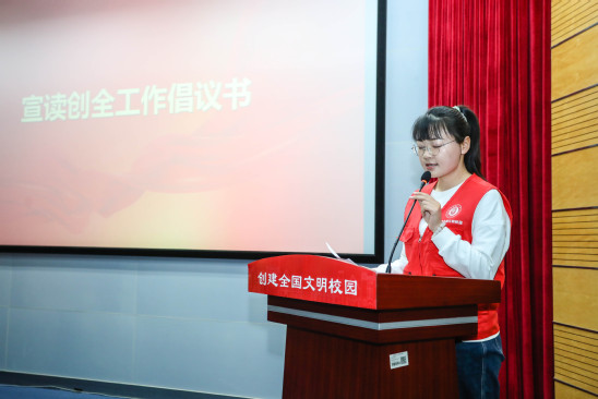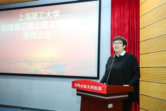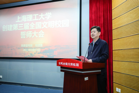 教師代表史玉和學生代表車紅玉分別宣讀創(chuàng)全工作倡議書。教務處、教工部、學工部、后勤處和版藝學院負責同志圍繞創(chuàng)全工作作表態(tài)發(fā)言,表示要積極作為、主動發(fā)力,共同打好創(chuàng)全攻堅戰(zhàn)。隨后,市文明辦、校領(lǐng)導和師生代表共同擂響上海理工大學創(chuàng)建第三屆全國文明校園的決勝戰(zhàn)鼓,傳遞信心、振奮精神,為學校創(chuàng)建成為第三屆全國文明校園的奮斗目標全力沖刺。