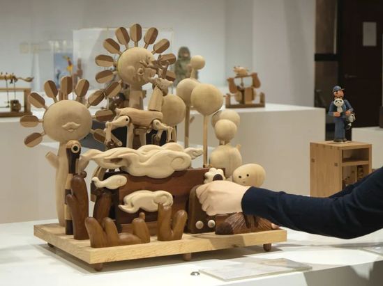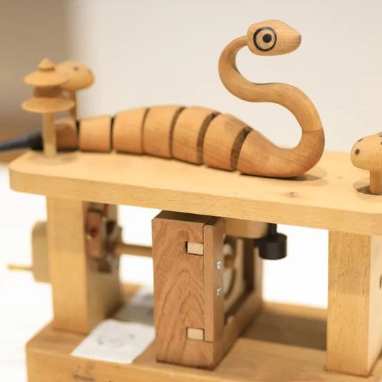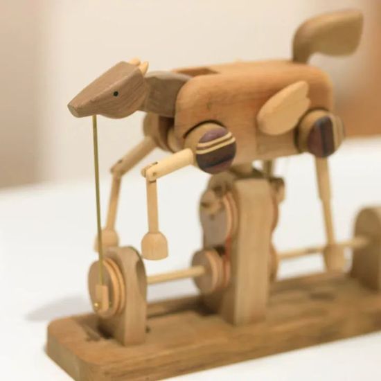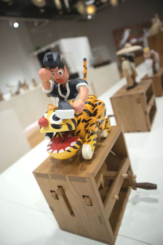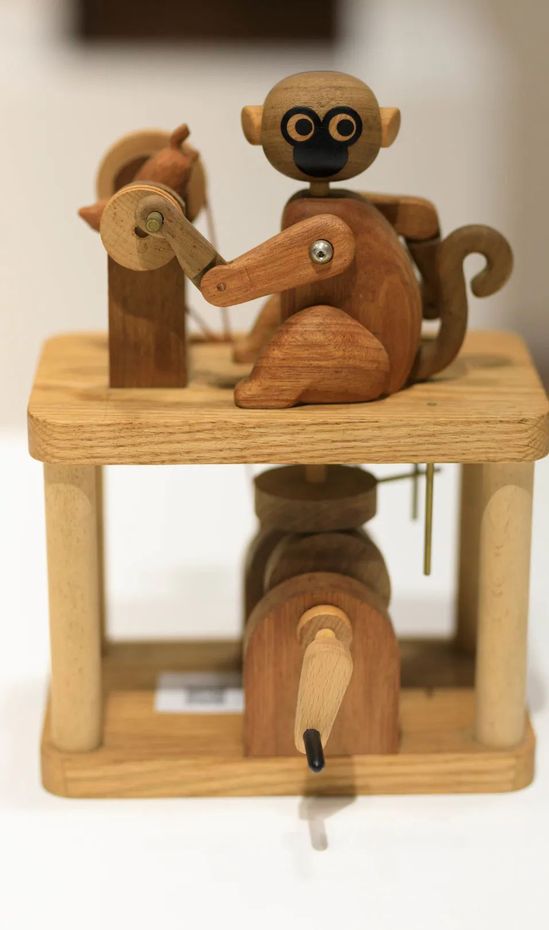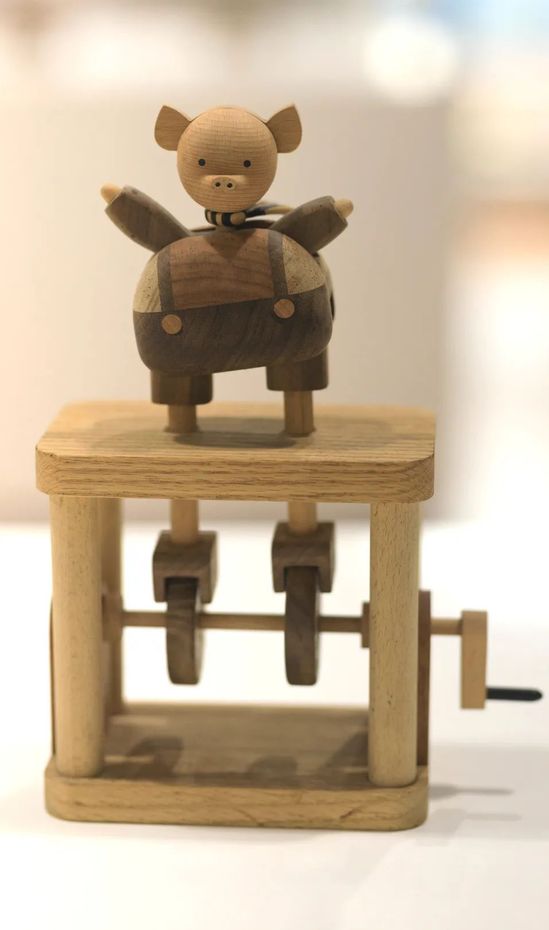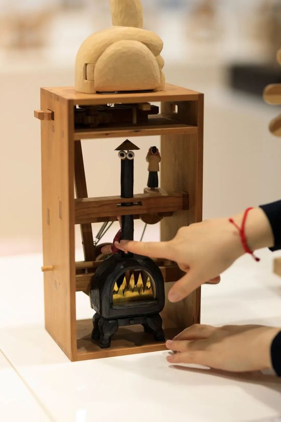 十二件形態(tài)各異的作品,出自于上海理工大學(xué)出版印刷與藝術(shù)設(shè)計(jì)學(xué)院老師宋方圓之手。裝置采用木工技藝與機(jī)械結(jié)構(gòu)相結(jié)合的手法,讓角色玩偶在一定時(shí)間跨度完成預(yù)設(shè)動(dòng)作,營(yíng)造出有趣幽默、頗具生命感的生肖立體形象。